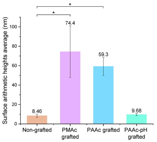 Surface roughness—arithmetic height averages of non-grafted and grafted silicones (* p = 0.05).