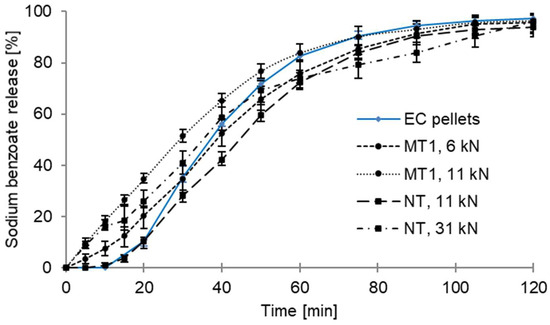 3.3. Sodium Benzoate Release from EC Pellets, Mini-Tablets MT1, and Normal Tablets NT