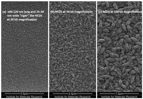 Figure 6 shows the CVD-grown diamond morphology of the top layer, deposited inside the same surface wave microwave plasma reactor used earlier to grow microcrystalline morphologies. The deposited morphology is completely different from the earlier CVD-grown diamond film microstructure (Figure 2) grown by the same reactor but without the addition of phosphine and additional substrate heating. In Figure 6, the microstructure of the diamond film looks cigar-like, elongated, and randomly oriented at a lower magnification of 20 kX due to phosphine gas addition in the precursor recipe [43]. At still-higher magnification (Figure 6b), it is found to have an aspect ratio of about 3:1, where the length is 150–200 nm and width of the feature is 70–80 nm. Figure 6c shows that the individual cigar-like structure is spindle-like in shape, with a broad middle portion and tapered ends. Each elongated structure is again found to be sub-divided into individual diamond nanoparticles of 30–40 nm in size. Earlier research results with nitrogen-doped diamond film showed high-aspect-ratio needle-like microstructures [55]. Therefore, the research question is raised here, i.e., whether P being another Group V element, such as nitrogen, also promotes a high-aspect-ratio diamond grain microstructure in the deposited film. The phosphine-based gas LAMWCVD recipe at an elevated temperature produced unique cigar-like NCD morphology, unlike the MCD-distributed NCD found on the bottom layer of the diamond (produced over long hours of LAMWCVD run). Therefore, the top-layer diamond surface is smoother than the bottom layer as-grown diamond surface.