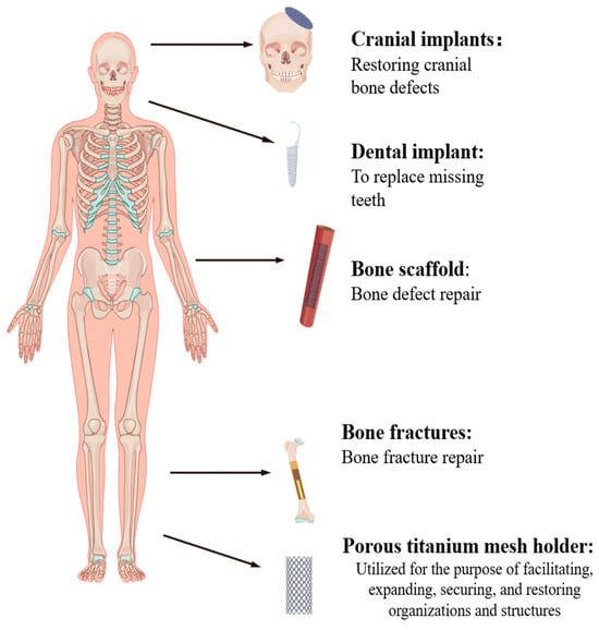 Titanium (Ti) alloy is a highly regarded biomaterial extensively utilized in the field of biomedicine, particularly in orthopedic implants, as illustrated in Figure 1. Ti alloys are used in cranial implants, dental implants, Ti mesh, and artificial joints [1,2]. Ti alloys typically consist of the main component Ti, as well as possible additional elements such as aluminum, vanadium, niobium, and zirconium. Ti as the main component provides the material with lightweight properties and excellent biocompatibility, reducing the risk of rejection reactions. The addition of elements like aluminum and vanadium can enhance the strength and corrosion resistance of the material, increasing its stability when implanted. The inclusion of niobium can improve biocompatibility and reduce tissue reactions, while zirconium alloys exhibit good biocompatibility and aesthetic properties in certain dental applications [1,3,4,5,6]. Nonetheless, conventional manufacturing processes for implants, including mechanical machining, injection molding, sintering, and computerized numerical control (CNC) machining [7,8,9], suffer from certain drawbacks. These limitations include prolonged processing durations, intricate processing procedures, diminished processing precision, and challenges in crafting intricate implant components. These shortcomings are being effectively addressed through the advancement of 3D printing technology. Within the realm of biomedicine, 3D printing methods such as selective laser melting (SLM), fused deposition modeling (FDM), and direct metal laser sintering (DMLS) have found applications [10,11,12]. In comparison to traditional machining methods, 3D printing presents a range of advantages, including accelerated production rates, reduced costs, and the capacity to fabricate intricate geometries [13]. At a microscopic level, personalized implants produced through 3D printing demonstrate meticulous control over the porous structure at the implant interface. This diminishes the stress-shielding effect and augments osseointegration [14]. On a macroscopic scale, 3D printing empowers the creation of intricate shapes and structures that are indispensable for tailoring implants to meet specific patient requirements. Certain individuals necessitate exceptionally specialized implant configurations to address unique surgical needs, a feat that proves challenging with conventional manufacturing methods.