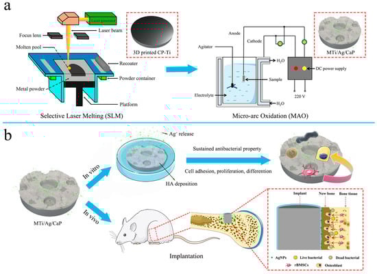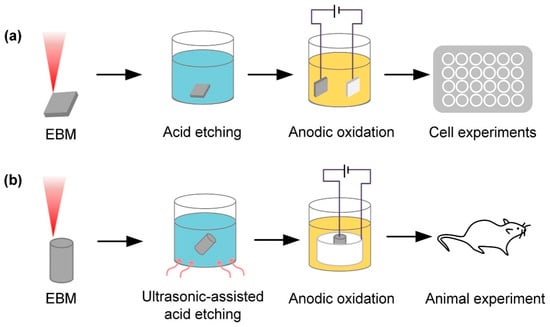 Ti alloy implants fabricated using electron beam melting (EBM) technology, with the surface anodized and acid-etched. (a) In vitro test after surface acid etching and anodic oxidation treatment. (b) In vivo test after ultrasonic acid etching and anodic oxidation treatment (Ren et al., 2021) [30].