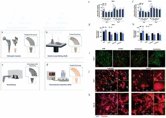 Behavior of osteoblast precursor cells with antibiotic-containing coatings on implant surfaces. (a,b) Ti alloy implants fabricated via SLM. (c,d) Sandblasting pre-treatment to increase surface roughness and eliminate surface defects, followed by EPD of antibiotic coatings onto implant surfaces. (e,f) Alamar blue cell metabolic activity assay after 1 and 3 days of cell culture on the implants. (g,h) Cell DNA content after 3 days of cell culture on the implants. (i) Live/dead staining of stem cell samples after 3 days (live: green; dead: red). (j,k) Cytoskeletal staining of stem cell samples after 7 and 14 days (DAPI: blue; phalloidin: red). Cytoskeletal staining on days 7 and 14 showed more extensive F-actin tissues on NSB structures; cells on SB structures were more elongated with greater spreading (Jahanmard et al., 2020) [37].) (p < 0.05; a with b, c with d, and * shows the significant differences between SB and NSB).