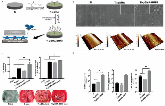Preparation of recombinant human bone morphogenetic protein−2 (BMP−2)-immobilized Ti implants via CVD technique. (a) The process of attaching bone growth protein to the surface of Ti implants through CVD. (b) Characterization of the Ti surface revealed a uniform 60 nm thick pGMA layer. (c) Osteogenic activity of hASCs on Ti, Ti-pGMA, and Ti-pGMA-BMP2 surfaces measured by alkaline phosphatase activity; calcium deposition quantification and Alizarin Red S staining images showed good osteogenic activity in the Ti-pGMA-BMP2 group compared to the other two groups. (d) Real-time PCR analysis of osteogenic mRNA gene expression levels in hASCs cultured in osteogenic induction media on the surfaces of Ti, Ti-pGMA, and Ti-pGMA-BMP2, quantifying the expression levels of OCN, Runx2, and COLII as markers of osteogenesis after one day of culture. The mRNA levels of OCN, Runx2, and COLII in the Ti-pGMA-BMP2 group were significantly higher, indicating effective differentiation into osteoblasts (Youn et al., 2019) [40]. (* p < 0.05 and ** p < 0.01).