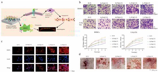 Chimeric peptides rapidly modify the surface of personalized 3D-printed Ti implants. (a) The schematic diagram illustrates the modification process of the Ti surface using fusion peptides. (b) The migration ability of BMSCs and EAhy926 cells cultured on the surface of implants and the proliferation of these cells were significantly enhanced on the fusion peptide-modified Ti surface compared to the D-Ti group. The number of migrated cells in the L-P1&2-Ti and L-P3&4-Ti was higher than that in the S-P1&2-Ti and S-P3&4-Ti, with L-P3&4-Ti group showing more migration of BMSCs and EAhy926 cells compared to L-P1&2-Ti group. (c) Immunofluorescence staining revealed an upregulation of vascular endothelial growth factor (VEGF: red; cell nucleus: blue) expression in L-P1&2-Ti and L-P3&4-Ti groups compared to the D-Ti group. (d) In vitro studies demonstrated that fusion peptides promote bone integration, with more formation of calcified nodules observed in the L-P3&4-Ti group compared to the L-P1&2-Ti group and significantly more than S-P1&2-Ti and S-P3&4-Ti (Zhao et al., 2021) [35].