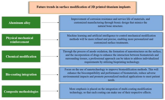 The future development trends in the surface modification of 3D-printed Ti alloy implants will encompass physical, mechanical, chemical, and bioconvergence modifications and functional composite coatings, as shown in Figure 9. Furthermore, the future development of physical–mechanical modification technology, with the promotion of interdisciplinary integration, will enable achieving the controllability and designability of the surface morphology and performance of implants through precise control, intelligent computer design, the introduction of new technologies, and personalized manufacturing. Concurrently, chemical modification methods will utilize more bioactive materials and nanotechnology to promote cell adhesion and osteoblast proliferation, enabling more effective tissue regeneration and repair. Furthermore, bioconvergence modification technology will incorporate cell engineering and genetic engineering techniques to directly implant cell adhesion factors or growth factors, expediting the integration of the implant with the host bone. A potential method for the surface modification of orthopedic implants with promising prospects is functional composite surface modification. In the future, personalized treatment will become mainstream, as each patient’s orthopedic needs are unique. Some individuals may require improved bone cell growth, while others may need better wear resistance or infection resistance. Composite methods can customize the implant surface based on the specific needs of the patient, thereby achieving personalized treatment. This will help improve surgical success rates and patient satisfaction. Additionally, a single surface modification method may not be able to provide all the required performance characteristics. For example, a single anodization may not simultaneously achieve antibacterial and adhesive properties. However, coatings with an antibacterial layer after anodization can effectively enhance the implant’s antibacterial properties and cell adhesion. On the other hand, drug delivery and infection prevention on the implant’s surface are crucial. Composite methods can combine drug delivery systems with bio-coatings to prevent infection or accelerate healing. This is essential for the management of long-term implants. Composite surface modification encourages researchers to constantly seek new combinations and techniques to meet evolving patient needs. With the continuous progress of science and technology, new surface modification methods and materials will continue to emerge. Composite methods provide flexibility and feasibility for integrating these new technologies in the future. In summary, composite surface modification has the advantages of adaptability, great potential for personalized treatment, and overcoming the limitations of single methods. Therefore, it is expected to become the most promising surface modification method in the field of orthopedic implants in the future. This will help improve the performance of implants, reduce complications, and improve patients’ quality of life. However, these advancements necessitate rigorous scientific validation and clinical practice to ensure their safety and efficacy.