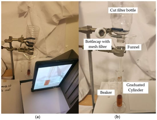 A timed gravity leakage test with pure motor oil was conducted to obtain a quantifiable performance of the filtration capabilities and the efficiency of each different mesh size and coating [28]. The test was conducted by pouring 50 mL of Pennzoil Conventional 10W-30 Motor Oil into the funnel, which was then recorded until no more oil was in the original vessel. The whole leakage test was timed and filmed, as shown in Figure 3a. The custom filter vessel was placed above a funnel that was set atop a 50 mL graduated cylinder, as shown in Figure 3b. The time was measured for every mL during the video playback.