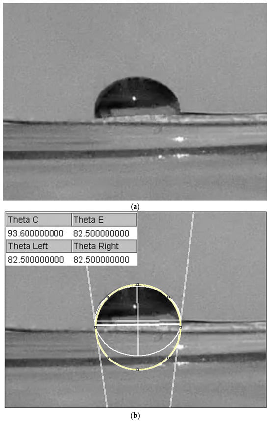 The contact angle was used to measure the wettability of the coated filters. A larger contact angle means higher oleophobicity [29,30]. It was hypothesized that the treated filters would have a larger contact angle compared to untreated filters. To measure the contact angle of the filter, a video was taken of a droplet of motor oil (Pennzoil Convention 10W-30) using a syringe. A single frame was taken from the video when the droplet first made contact and was observed with the use of software add-ons (Contact Angle and Drop Shape Analysis) to ImageJ (Version 1.46, U.S. National Institutes of Health, Bethesda, MD, USA). To measure the contact angle, as shown in Figure 4, the averages of the contact angle results from Contact Angle written by Marco Brugnara (for more details, please refer to https://imagej.net/ij/plugins/contact-angle.html (accessed on 11 October 2023)) and Drop Shape Analysis written by Aurélien Stadler and Daniel Sage (https://bigwww.epfl.ch/demo/dropanalysis (accessed on 11 October 2023)) were used.