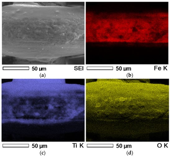 EDS of specific elements on two-layer TiO2 nanoparticle coating on mesh 100. (a) Raw scan; (b) Fe; (c) Ti; (d) O.