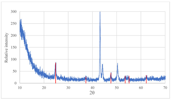 Elemental analysis and structure characterization of the coating were carried out using EDS and XRD. The elemental results from EDS provide insight into the distribution and the relative abundance of elements such as titanium, oxygen, and iron, as shown by the color maps in Figure 6. The titanium presence should be related to the TiO2 present from the nanopowder coating. The atomic proportion of titanium in the single-layer coating was 10.2%. This further increased to 13.5% when an additional layer of coating was applied. XRD was performed with a Bruker D2 Phaser; it has been observed that anatase TiO2 peaks are found predominantly at 2θ values: 24.8°, 37.3°, 47.6°, 53.5°, 55.1°, and 62.2° [33]. Figure 7 depicts the referenced 2θ values for anatase TiO2 with solid, vertical red lines. Discrediting potential noise from the mounting plate and substrate material, the graphical results indicate a clear presence of anatase phase TiO2 from the coating. Strong diffraction peaks at 24.8°and 47.6° provided confirmation of the anatase structure [34].