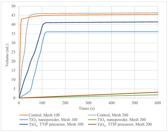 Figure 8 shows the data collected for coated and control mesh size 100 and mesh size 200. Mesh size 80 had similar results to mesh size 100. The TiO2 coating completely clogged the mesh size 400, and thus, did not allow any fluid to pass through. Consequently, the results from mesh sizes 80 and 400 results were disregarded. The smaller volumes of oil filtrate represent a better separation performance. The results demonstrate that coated meshes show a significant improvement as opposed to the uncoated filters. This was expected as the TiO2 coating composition has significant oleophobic properties. The TiO2 nanopowder-coated filter performed slightly better than the one made from TTIP precursor for both mesh sizes 100 and 200. This indicates that there is a notable difference in effectiveness when synthesizing TiO2, with the nanopowder producing a more effective coating.