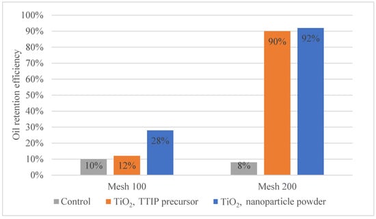 Figure 9 shows the oil retention efficiency of filters of different aperture sizes and coating methods. The coated mesh 200 filters showed a substantial enhancement compared to the mesh 100 filters. Compared to the control, the coated mesh 200 also had an 82%–84% improvement in efficiency. The TiO2 coating from nanopowder demonstrated slightly better results compared to the one made from the TTIP precursor solution. In the video demonstration provided in the Supplementary Materials, a similar conclusion is seen. In the video, mesh 200 with the TiO2 nanopowder showed an almost perfect separation of oil and water. In comparison to a similar study regarding the use of amorphous TiO2 [18], the oil retention rate of both coated filters in this work shows a clear improvement. Given a 300 s time frame, the total volume filtered using the coated mesh 200 was below 2 mL. The lower limit of the volume filtered using sonicated coffee filters was approximately 3 mL [18]. Thus, the anatase TiO2-coated stainless-steel filters provide evidence of improved oil blockage from the previous study.
