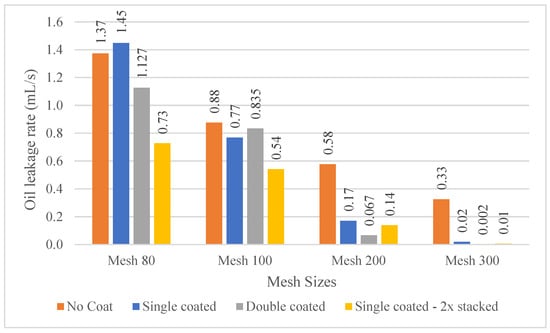 Coating thickness was also a factor to consider in evaluating the performance of the TiO2 nanopowder coating. Thickness was previously demonstrated to be impacted by the number of layers applied to the coating, so multiple coating thickness conditions were tested among varying mesh sizes. Figure 10 demonstrates the general effect of coating thickness on the leakage rate of oil; it confirms the improvement in oil retention due to decreasing aperture size.