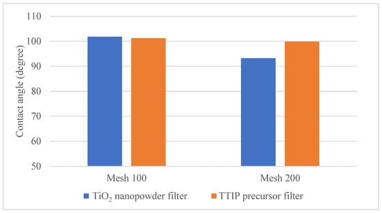 The SEM images of the stainless-steel mesh control specimen and the coated filters are shown in Figure 5. The aerosol spray method was applied to obtain a uniform coating on small aperture meshes. Following the aerosol application, the excess liquid solution was removed using compressed air. This process was repeated twice for mesh sizes 100 and 200. Sintering at 450 °C was expected to retain the anatase phase of TiO2, as a comparable temperature (500 °C) has been studied among temperature ranges between 500 to 900 °C [31]. Temperatures greater than 900 °C have been proposed as anatase–rutile phase transition temperatures for metastable TiO2 [32]. Thus, it was expected that the desired hydrophilic properties of anatase TiO2 would be retained throughout the sintering process.