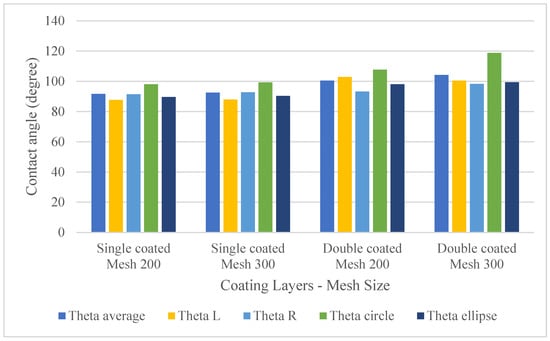 While both coatings resulted in oleophobic and hydrophilic properties, it was previously concluded that the nanopowder coating outperformed the one from the TTIP precursor during the filtration test. Figure 12 displays an examination of the effect of coating thickness on the effective contact angle of the coating. A clear trend is shown when viewing the Theta average bars in Figure 12. The average measured contact angle increased due to increasing coating thickness as well as decreasing aperture diameter. This correlates with the improved filtration results previously discussed, as increasing contact angle between oil and coated filter indicates increased oleophobicity.