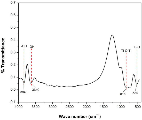 The results of the analysis of the FTIR spectrum of the TiO2-NPs (Figure 2) identified the functional groups of Ti-O at a wave number of 524 cm−1 and Ti-O-Ti at a wave number of 816 cm−1 which were bonds formed in the framework of the TiO2 compound. The spectrum of TiO2 shows intense peaks at 3640 and 3848 cm−1, owing to the stretching of the OH group of the H2O molecule from the air that binds to the TiO2 compound through the adsorption process [48]. This indicates that the material synthesised via the hydrothermal method was a TiO2 compound.