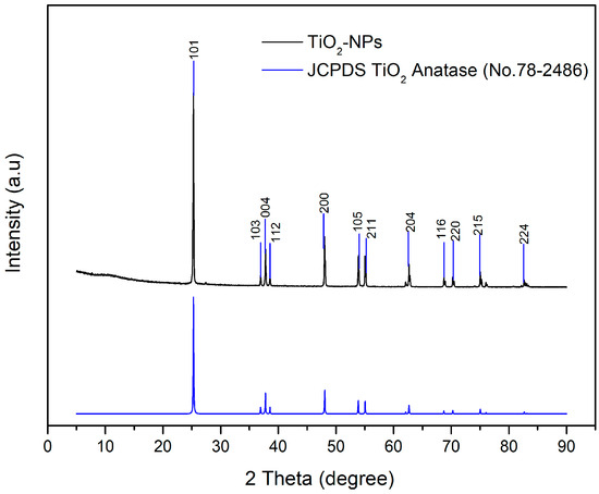XRD analysis was used to determine the phase and degree of crystallinity of the TiO2-NPs synthesised using the hydrothermal method. The diffractogram (Figure 3) shows peaks at 2θ values of 25.20°, 36.83°, 37.67°, 38.67°, 47.91°, 54.02°, 55.22°, 62.75°, 68.63°, 70.47°, 74.96°, and 82.55°. Based on a comparative analysis of the standard diffractogram of anatase TiO2 JCPDS card number 78-2486 [35], these peaks can be attributed to anatase TiO2 compounds synthesised via the hydrothermal method. The degree of crystallinity of the TiO2-NPs was determined by comparing the crystalline lattice with the total number of lattices in the diffractogram (amorphous and crystalline). The degree of crystallinity is crucial since it is closely related with the reactivity and optical properties of the TiO2-NPs. The higher the degree of crystallinity of a material, the better its reactivity and optical properties when applied as a catalyst or advanced material [49]. The calculated results show that the synthesised TiO2-NPs have a high degree of crystallinity (99.75%).