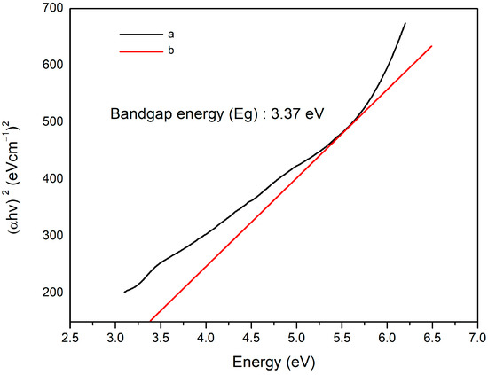 The optical properties of a material are determined by its interaction with electromagnetic radiation. These optical properties can be tested in the UV, visible-light, and infrared wavelength ranges for semiconductors such as TiO2. The optical properties strongly depend on the bandgap energy [52]. Band gap energy analysis can be performed via the Tauc method (see Figure 5), based on the assumption that the energy affected by the absorbance coefficient (α) can be determined by the following: