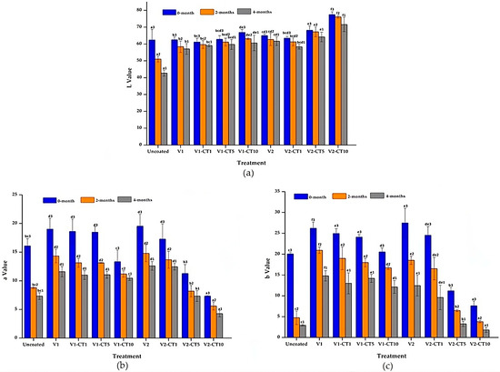 (a) L value, (b) a value, and (c) b value for uncoated and coated mangium wood during a weathering test lasting 4 months, with tests at 0, 2, and 4 months. V1 and V2 denote oil- and water-based varnishes applied to the wood, respectively. CT1, CT5, and CT10 denote 1, 5, and 10% concentrations of TiO2 nanoparticles in the coating. Note: The letters (a, b, etc.) and numbers (1, 2, etc.) followed by the same letters and numbers do not differ significantly (α = 0.05) based on the Duncan multiple-range test.