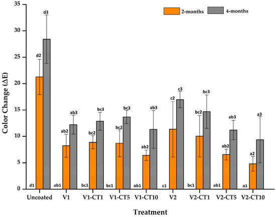 Total colour change for uncoated and coated mangium wood after a weathering test lasting 0, 2, and 4 months. V1 and V2 denote oil- and water-based varnishes applied to the wood, respectively. CT1, CT5, and CT10 denote 1, 5, and 10% concentrations of TiO2 nanoparticles in the coating. Note: The letters (a, b, etc.) and numbers (1, 2, etc.) followed by the same letters and numbers do not differ significantly (α = 0.05) based on the Duncan multiple-range test.