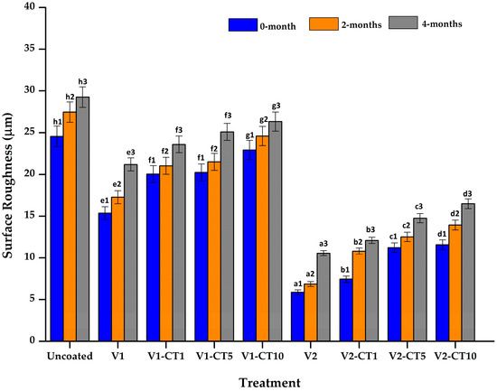 Surface roughness for uncoated and coated mangium wood during the weathering test. V1 and V2 denote oil- and water-based varnishes applied to the wood, respectively. CT1, CT5, and CT10 denote 1, 5, and 10% concentrations of TiO2 nanoparticles in the coating. Note: The letters (a, b, etc.) and numbers (1, 2, etc.) followed by the same letters and numbers do not differ significantly (α = 0.05) based on the Duncan multiple-range test.