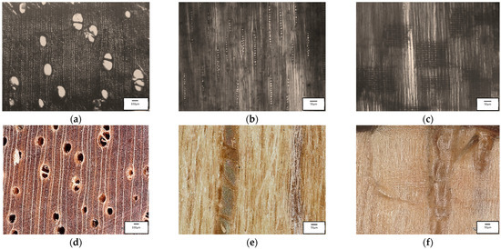 (a) Microscopic cross section of an uncoated mangium wood sample (100×), (b) Microscopic tangential section (100×), (c) Microscopic radial section (100×), (d) Macroscopic cross-section (100×), (e) Macroscopic tangential section (200×), and (f) Macroscopic radial section (200×).