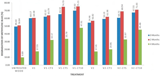 An investigation into the effectiveness of photocatalyst activity with varying amounts of active compounds of TiO2-NPs was carried out by testing the degradation of MB (Figure 13). MB is highly stable and requires a long time to degrade in conditions without catalysts [64]. The result obtained in Figure 11 indicates that the nanocoating sample containing TiO2-NPs had a higher photocatalyst activity compared to that of the uncoated wood and V1- and V2-coated wood samples. The samples with the highest percentage MB degradation values were the V1-CT10 and V2-CT10 samples subject to two months of weathering, at 75.21% and 71.03%, respectively. This indicates that the concentration of the active compound TiO2-NPs was positively correlated with the photocatalyst activity to degrade MB. These results are similar to and corroborate the research conducted by Akkuş et al. [65].