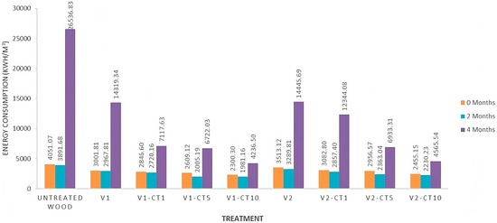 According to the Hunter Lab classification [37], the total colour changes (Figure 8) of mangium wood, both uncoated and coated, were very large (E > 6). The total colour change increased after the weathering tests. The uncoated mangium wood produced the highest colour change (20.31 after 2 months and 27.47 after 4 months. The mangium wood coated with a nanocoating (CT samples) had a low total colour change, especially at a concentration of 10%. The total colour changes of the V1-CT10 treatment were 6.2 after 2 months and 11.31 after 4 months. Meanwhile, the total colour changes for the V2-CT10 treatment were 5.6 after 2 months and 9.3 after 4 months.
