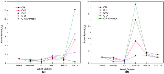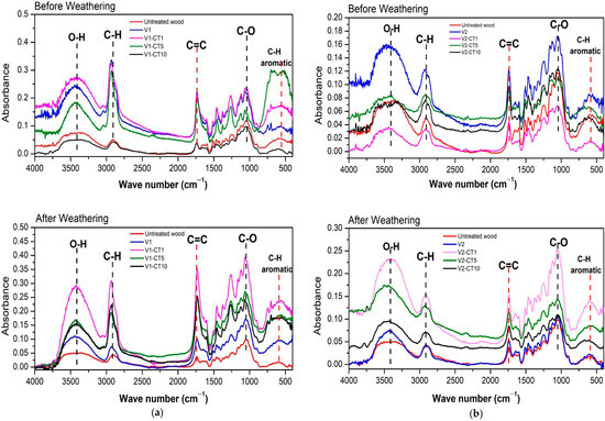 Degradation analysis of biopolymers, such as wood, was performed by identifying the absorption patterns of wood functional groups in the FTIR spectrum. Quantitative analysis was performed by calculating the ratio index of the absorption bands of the functional groups using Equation (7) [43],