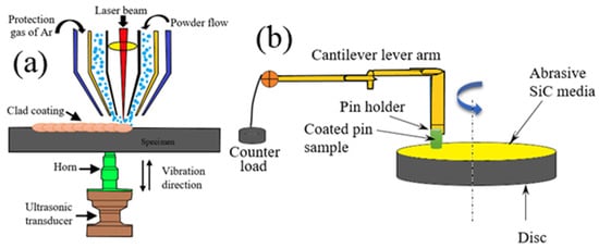 (a) Schematic of the laser cladding process used, (b) Wear test schematic.