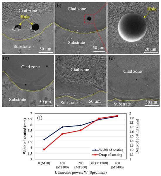 Coating cross-section of specimens (a) MT0, (b) MT100, (c) MT200, (d) MT300, (e) MT400, (f) Change of coating cross-section dimensions with changing ultrasonic power.