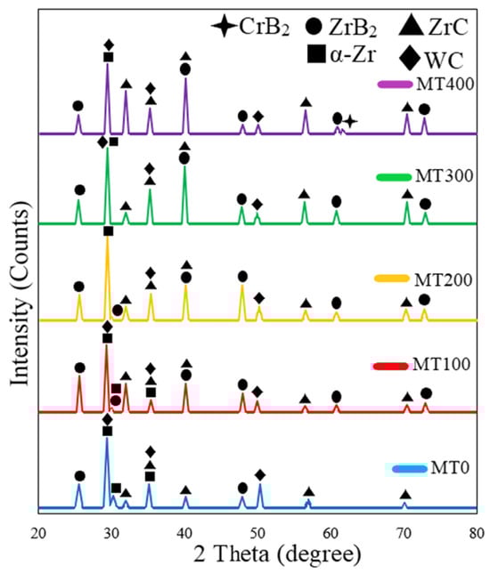 Figure 4 shows the XRD results for all five types of coatings. The change of the peaks in the observed patterns indicates the effect of the ultrasonic field on the formation of the coating. As can be seen, there are ZrC, WC, and α-Zr phases in the MT0 specimen pattern. By applying the ultrasonic field, the synthesized ZrB2 phase was also detected. In specimen MT400, a type of boride rich in Cr (CrB2) was detected. It seems that the decomposition of ZrB2 promotes the in situ synthesis of the reinforcement and causes the formation of this phase []. However, there is a possibility of forming carbide phases due to the decomposition of amplifiers with increasing ultrasonic power. However, due to the small amount, they cannot be detected by XRD. The change in the location of the peaks indicated the effect of the ultrasonic field on the distribution and amount of coating enhancers.