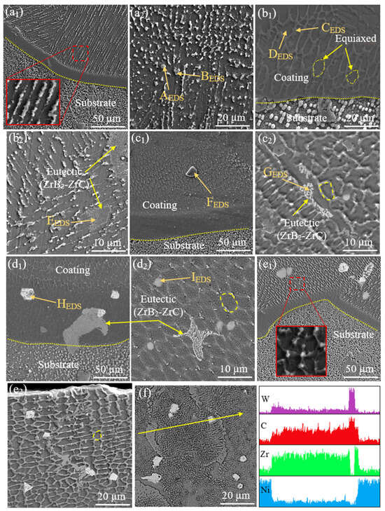 In addition to the size of the dendrites, it can be seen in Figure 5a–e that reinforcements around the dendrites are enriched. The results of EDS analysis of marked points are listed in Table 3. It can be seen that Zr (in α-Zr form) is the main component of all the marked points. The issues around the main component of dendrites, which is rich in Zr, are rich in ZrC, which is the result of the decomposition of WC and a result of the in situ reaction between C and Zr at high temperatures during laser cladding. As seen in Figure 5c, ZrC forms a grain boundary eutectic through combination with ZrB2. By increasing the ultrasonic power from 100 W to 200 W, the dendrite size of the ZrC phase decreased, especially at the bottom of the coating, which is attributed to the effect of ultrasonic vibration. This increased ZrC in terms of number. With the increase in ZrC, the amount of Zr decreased. The reason for this is the consumption of Zr atoms by ZrC, which prevents the growth of α-Zr. By increasing the ultrasonic power to 200 W and 300 W, (1) the decomposition of elements caused the formation of Cr7C3 carbide, (2) the size of the dendrites became smaller, and the secondary dendritic arms increased, and (3) the increase in the temperature of the melt (due to the cavitation effect) increased the affinity the combination of B and Zr in the molten pool resulted in the formation of more ZrB2.