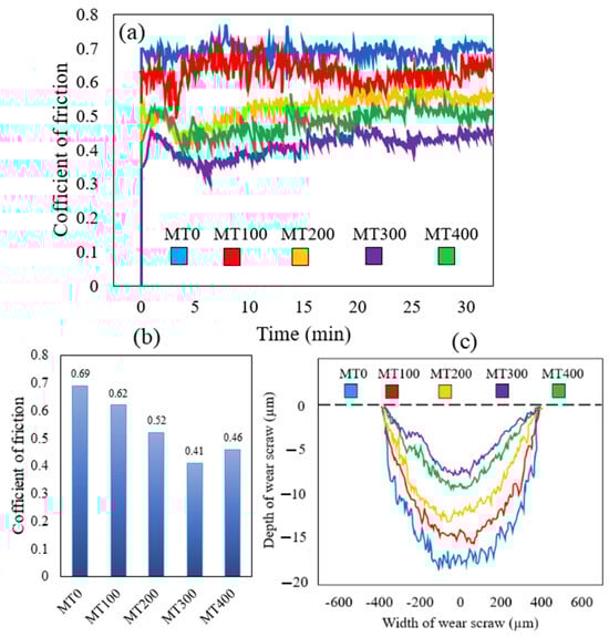 The wear test results of MT1~MT400 samples, (a,b) COF, (c) Scar wear.