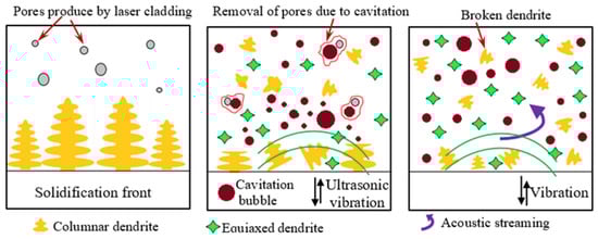 Schematic of the process of the effect of cavitation effect on the solidification of the coating pool.
