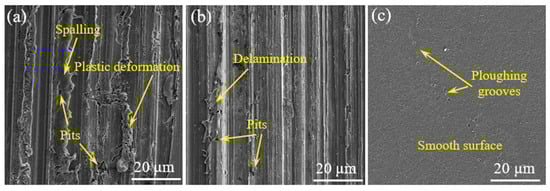 SEM morphologies of wear marks, (a) MT0, (b) MT100, (c) MT300.