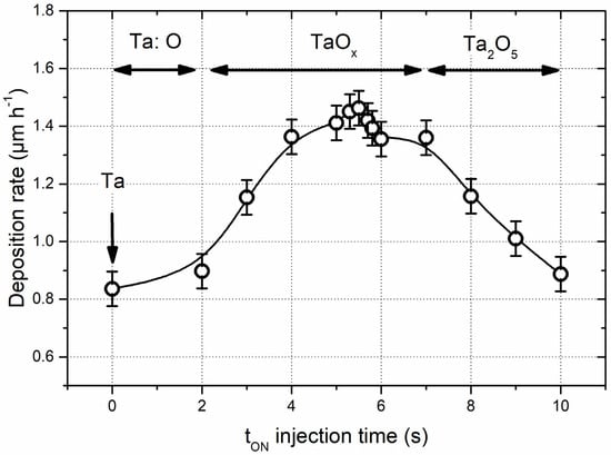 Influence of tON injection time on the TaOx deposition rate. Oxygen mass flow rate is pulsed with a constant rectangular period T = 10 s. Deposition rate gradually changes and exhibits a maximum for tON close to 5 s. Three zones, namely Ta:O, TaOx, and Ta2O5-like compounds, are suggested as a function of the tON injection time.