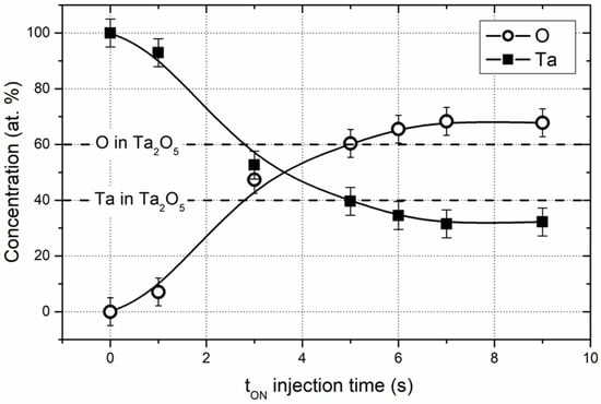 Assuming the tON injection time as a key parameter for producing TaOx films with various compositions, one may suggest three zones in Figure 1. Two zones correspond to the deposition of Ta:O films for the very short tON injection times (lower than about 2 s), and amorphous a-Ta2O5-like films for the longest ones (higher than about 6 s). Between these two tON injection times, TaOx compounds can be prepared. These adjustable film compositions are well illustrated, plotting the tantalum and oxygen concentrations as a function of the tON injection time (Figure 2).