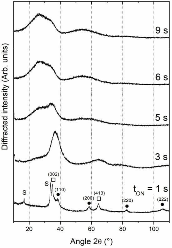 Chittinan et al. also deposited tantalum oxide films by reactive sputtering with the same strategy, i.e., oxygen pulsing []. In the same way, they produced films exhibiting an amorphous structure by conventional reactive sputtering or whatever their pulsing conditions. They recorded very similar X-ray diffraction patterns to our results obtained with tON injection times higher than 5 s, as shown in Figure 3.