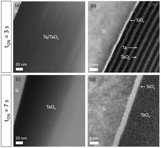 The poorly defined microstructure observed from SEM cross-sections (Figure 4) has been more precisely investigated by HRTEM observations and with a higher magnification. Two types of films can be prepared by adjusting the tON injection time: periodic multilayers or homogeneous tantalum oxide films (Figure 5). For tON = 3 s (Figure 5a,b), regular and nanometric Ta/TaOx alternations are clearly produced with a period Λ = 3.4 nm regularly stacked through the total film thickness. The native silicon oxide layer (2–3 nm thick) is also clearly viewed at the film/substrate interface (Figure 5b,d). The highest magnification (Figure 5b) shows that interfaces between metallic Ta (dark bands) and oxide TaOx (bright bands) sub-layers are not frankly defined but gradually change. Despite very short times of oxygen gas supplies and stops (a few 102 ms are required to stabilize the pulsing signal at the beginning of tON and tOFF times), oxygen species are not instantaneously evacuated for the sputtering chamber. In addition, oxygen diffusion from TaOx to Ta sub-layers cannot be neglected leading to gradual and periodic variations of Ta and O concentrations through each sub-layer. However, the profile analysis (to see Figure S1 in Supplementary Materials) clearly brings to the fore the nanometric period with metal and oxide alternations exhibiting a metallic thickness λTa = 1.9 nm (dark bands) and an oxide TaOx sub-layer λTaOx = 1.5 nm (bright bands). Ta and O atomic concentrations determined by energy-dispersive X-ray spectroscopy reveal an oxygen-rich composition in the oxide sub-layer with 73 ± 4 at.% of O and 27 ± 4 at.% of Ta (to see Figure S2 in Supplementary Materials). These contents correspond to an oxide phase close to the Ta2O5 compound. A significant amount of oxygen is measured in metallic sub-layers with 10–19 ± 4 at.% of O and 81–90 ± 4 at.% of Ta, which is assigned to inclusion of oxygen in the Ta sub-layer. Even if a small probe size (1 nm) has been used for the EDX measurements, the presence of oxygen in the metallic sub-layers can also be explained by the widening of the electron beam crossing the specimen.