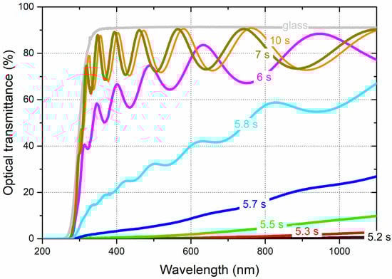 Absorption edge in the near UV region is also influenced by the oxygen supply with a blue shift as tON rises. This behavior has also been measured for other transparent metal oxide films prepared by reactive sputtering likewise pulsing the oxygen gas []. It is closely connected to oxygen vacancies in the film, which create states in the optical band gap, below the conduction band []. Increasing the tON injection time until a constant supply of oxygen reduces the density of oxygen deficiency in the films. Optical transparency in the visible region is favored and the band gap increases, which correlates with a slight shift of the absorption edge to lower wavelengths.