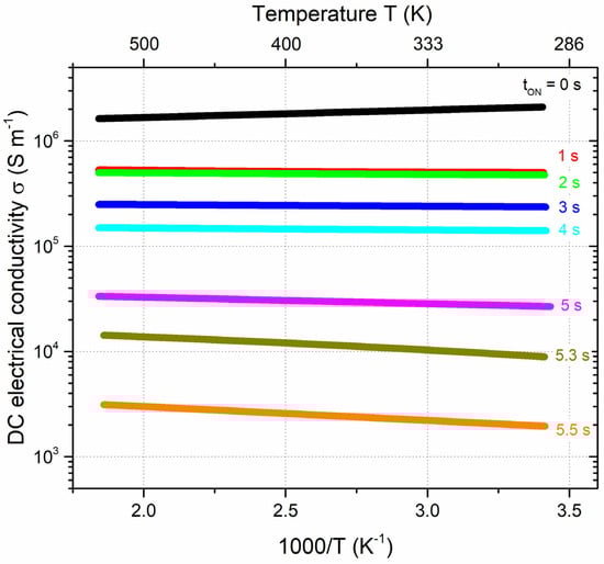 This gradual evolution of optical properties corroborates other investigations devoted to some metal oxide thin films prepared by RGPP []. Similarly, playing with a suitable range of tON injection times allows a wide tunability of many physical properties, not solely optical characteristics but electronic transport properties as well. To that end, the electrical conductivity of tantalum oxide thin films prepared on glass substrate and for different tON injection times was measured as a function of the temperature (Figure 7). Without oxygen injection (tON = 0 s), conductivity of pure Ta films is higher than 2.06 × 106 S m−1 at 300 K and is slightly influenced by the variation of temperature. The evolution of resistivity vs. temperature (not shown here) gives rise to a typical metallic-like behavior with a temperature coefficient of resistance (TCR300K) at a room temperature of 1.16 × 10−3 K−1. This value is lower than that of the bulk (TCR Ta bulk at 300 K is 3.54 × 10−3 K−1 []) as often reported for thin films and mainly assigned to the number of grain boundaries per electron mean free path in polycrystalline metallic thin films []. Increasing such a number, TCR reduces and can even exhibit a change in sign (from positive to negative) although the conductivity is kept in a metallic regime.