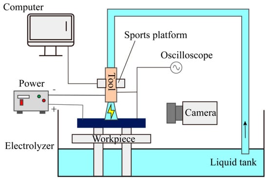 The electrolyte circulation system consists of a circulation tube, pressure control valve, pressure gauge, and reservoir and is an important part of the Jet-ECDM equipment. The pulsed high-voltage power supply has excellent characteristics such as reliable accuracy and outstanding stability. Under the control of the human–machine interaction, the sports platform can be moved along the x, y, and z axes to complete the precise machining of the workpiece. At the same time, fluctuations in current and voltage during online machining can be monitored in real-time with a digital oscilloscope.