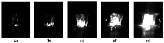 As can be seen in Figure 3, within the gas–liquid two-phase jet column, the discharge at the initial stage is mainly concentrated in the middle of the bottom of the column, where no discharge channel is formed, but rather presents discrete discharge points (Figure 3a,b). As time increases, the number of discrete discharge points gradually increases, spreading across the bottom and middle of the jet column (Figure 3c,d), and eventually, the discharge channel of the jet column is realized between the two poles (Figure 3e), completing the discharge process.