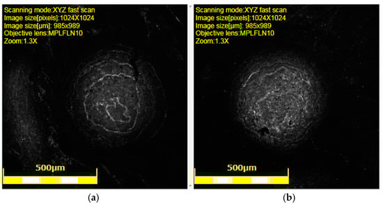 As shown in Figure 4, the workpiece first appears as a ring-like structure at the beginning of machining, with obvious discharge marks at the bottom of the crater over time. As the machining time increases, the discharge channels begin to build up, and a stable discharge is formed. By only turning down the machining voltage, for example, setting the machining voltage to 50 V, and keeping other machining conditions unchanged, the morphology of the machined crater does not show the special pattern of the ring-like structure [,,,].