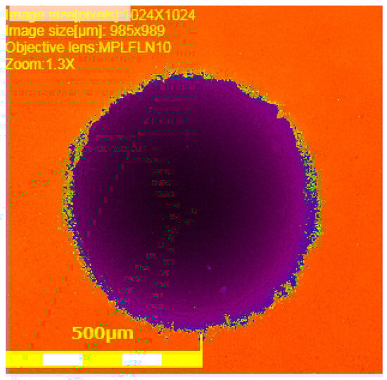 Figure 5 shows the 3D colour, and the depth and width dimensions of the pits, respectively. It can be seen from the figure that the side walls of the pits processed by the jet mask electrolytic discharge are steep and straight, and the bottom is flat, with better processing quality. Further analysis of the 2D colour diagrams of the pits is shown in Figure 6.