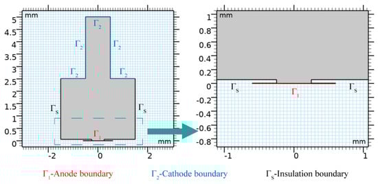 In the pre-processing phase, the geometric model of the machining area is first drawn, and then the individual physical fields are added in turn. The simulation analysis is carried out using COMSOL 6.1 software, mainly using the electrochemical module. The electrochemical module, in turn, uses the corrosion, deformed geometry module, which is based on two main blocks: the primary current distribution and the deformation geometry. In the primary current distribution, relevant parameters such as electrolyte, insulation, electrode surface, and initial values are set. The electrolyte fills the simplified geometry space, the insulation boundary is mainly the mask area boundary, and the model is simplified as shown in Figure 7.