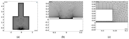 After the pre-processing is complete, the meshing is carried out. Good or bad meshing will affect the accuracy of the simulation results. To improve the quality of the meshing, the geometric boundary is divided into layers, the rest of the area is a free-dissecting triangular mesh, and the mesh around the anode is refined. The mesh at the mask hole is more finely cut, thus ensuring the accuracy of the simulation results. To make the calculation easier to converge, a gap of 5μm is set between the mask and the anode, as shown in Figure 8. After completing the meshing, the simulation model is solved. The experimental factor scan speed is equated to the calculation time in the simulation and is uniformly set to t = 1 s with a time step of 0.1 s.