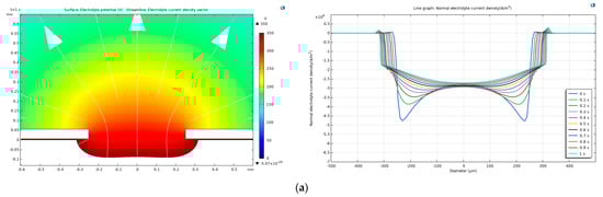 Voltage values of 350, 400, 450, and 500 V were chosen for the electric field simulation analysis. For post-processing, the potential cloud plot at the last time point (t = 1 s) and the (interval time 0.1 s) current density plots at different time points were selected, as shown in Figure 9.