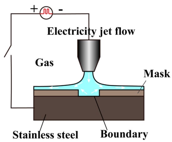 The perturbation case is not considered in the model, and the liquid jet between the two is simplified to a cylinder with a steady flow and a homogeneous morphology. Around its periphery is air, and the air and liquid electrical jets have a strict boundary (gas–liquid boundary). The thick grey arrows represent the direction of the jet, where the electrolyte is ejected from top to bottom under high voltage and pressure conditions, working on the stainless steel workpiece directly below.