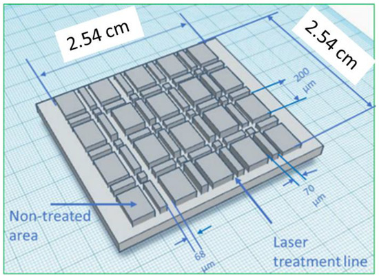 The emergence of different techniques to modify microstructures has advanced the development of alternative sources and methods in manufacturing techniques. However, each technique has advantages and disadvantages. There is variability in each technique’s ability to create large-volume surfaces, work on specific types of material, use toxic chemical compounds, and control the microstructure size [20]. Ultra-fast short-pulse laser techniques are the benchmark for improving microtextured processing [21,22,23]. A patterned solid surface with an ultrafast short-pulse laser device produces both laser-induced and laser-inscribed structures [24]. Since roughness is an essential factor in varying surface wettability, the details of laser-induced and laser-inscribed structures result in different roughness values in both micro/nanoscale structures. Additionally, morphological differences occur among these structures. These differences in the surface microtexture result in a direct effect on surface wettability [25], which is the focus of this study, as well as other properties, including optical [26], wear, and lubrication properties [23]. Moreover, machining with picosecond lasers can be obtained without contact—without a mask—and can be performed with a variety of patterns designed through programmed software (Trumpf Trutops PFO). Lastly, picosecond laser machining can produce a large fabrication volume in a short amount of time.